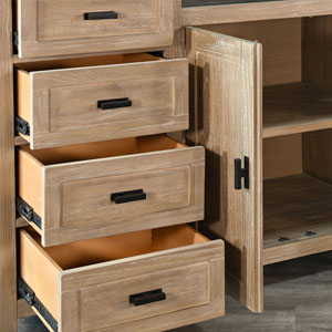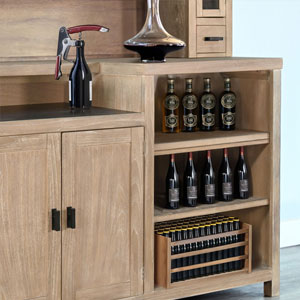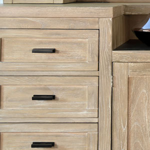 The Walton Back Bar combines functionality with timeless style. Crafted from wire-brushed mindi solids and veneers, it offers ample storage to keep your bar essentials organized and within reach. Finished in a warm Wheat tone, this piece brings a touch of rustic elegance to any space.