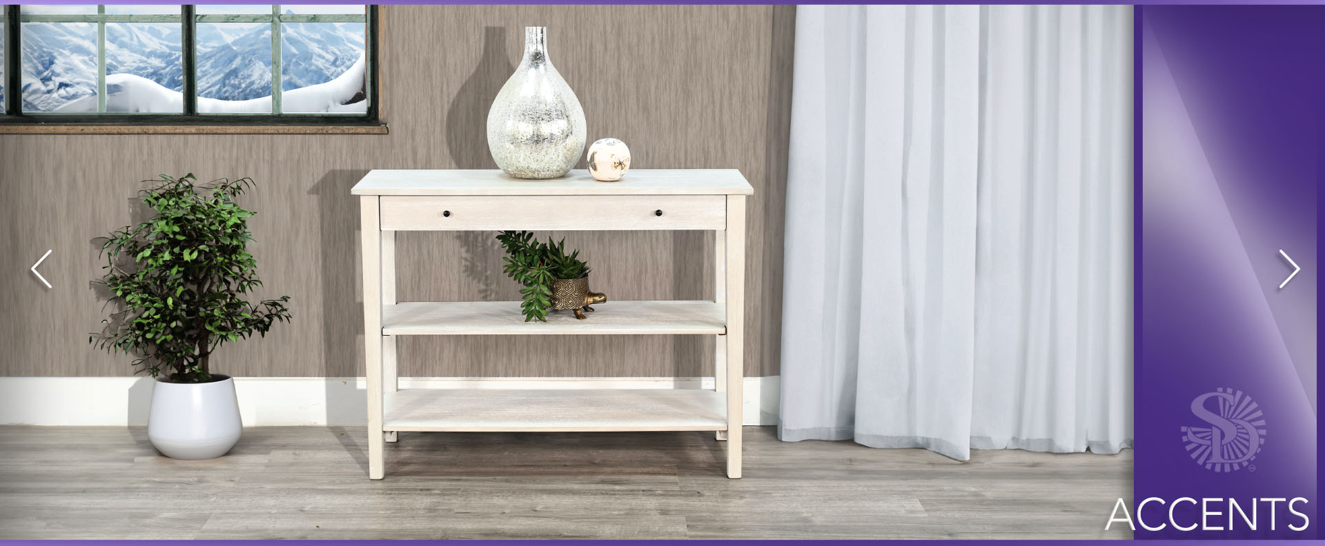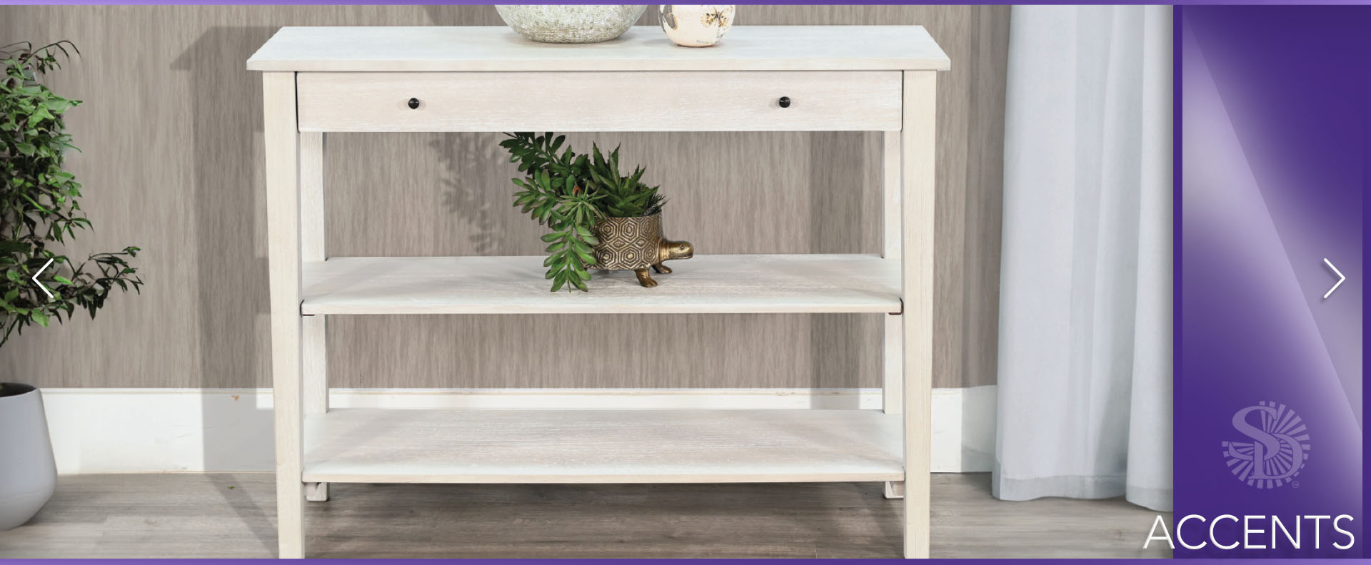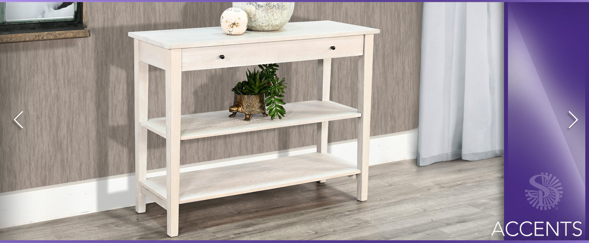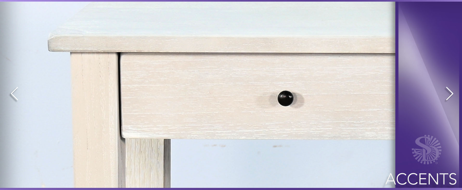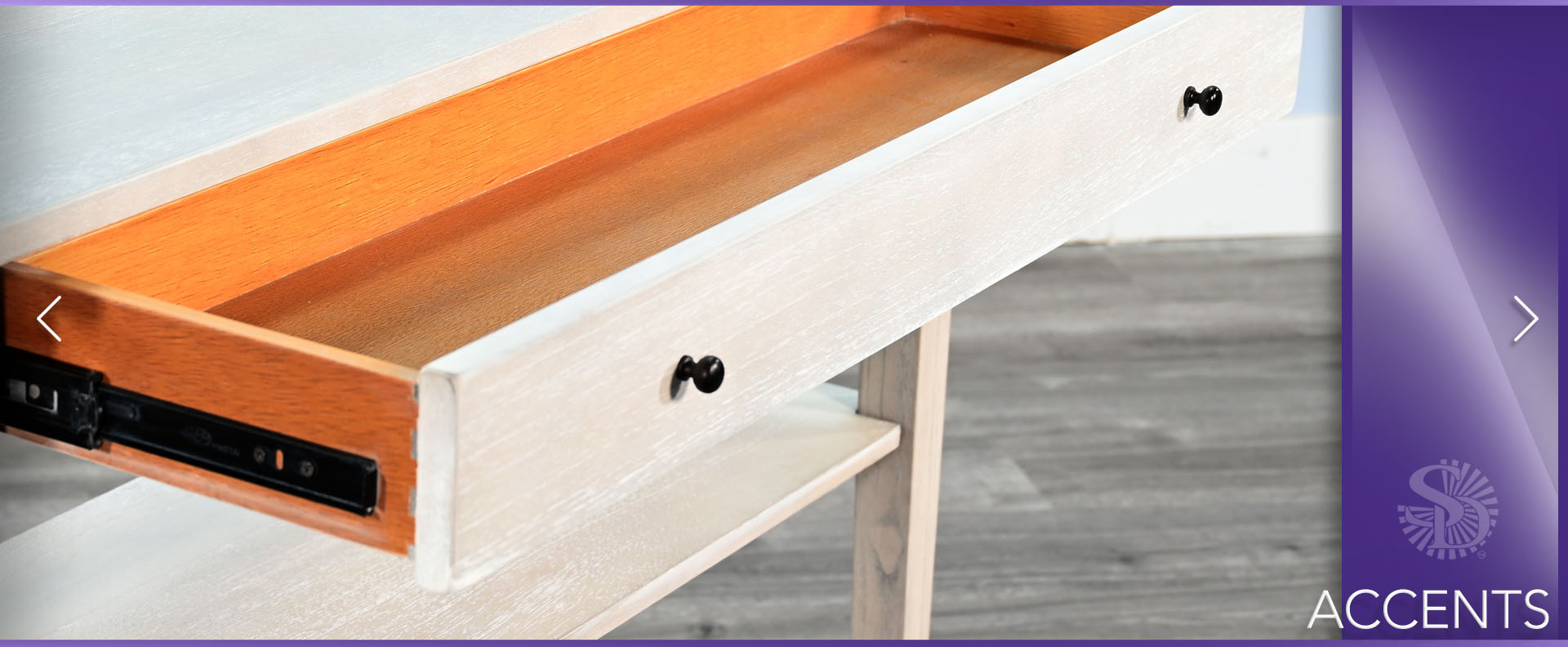 These small console offer a simple, eye catching appearance. They feature a single oversized drawer for all the