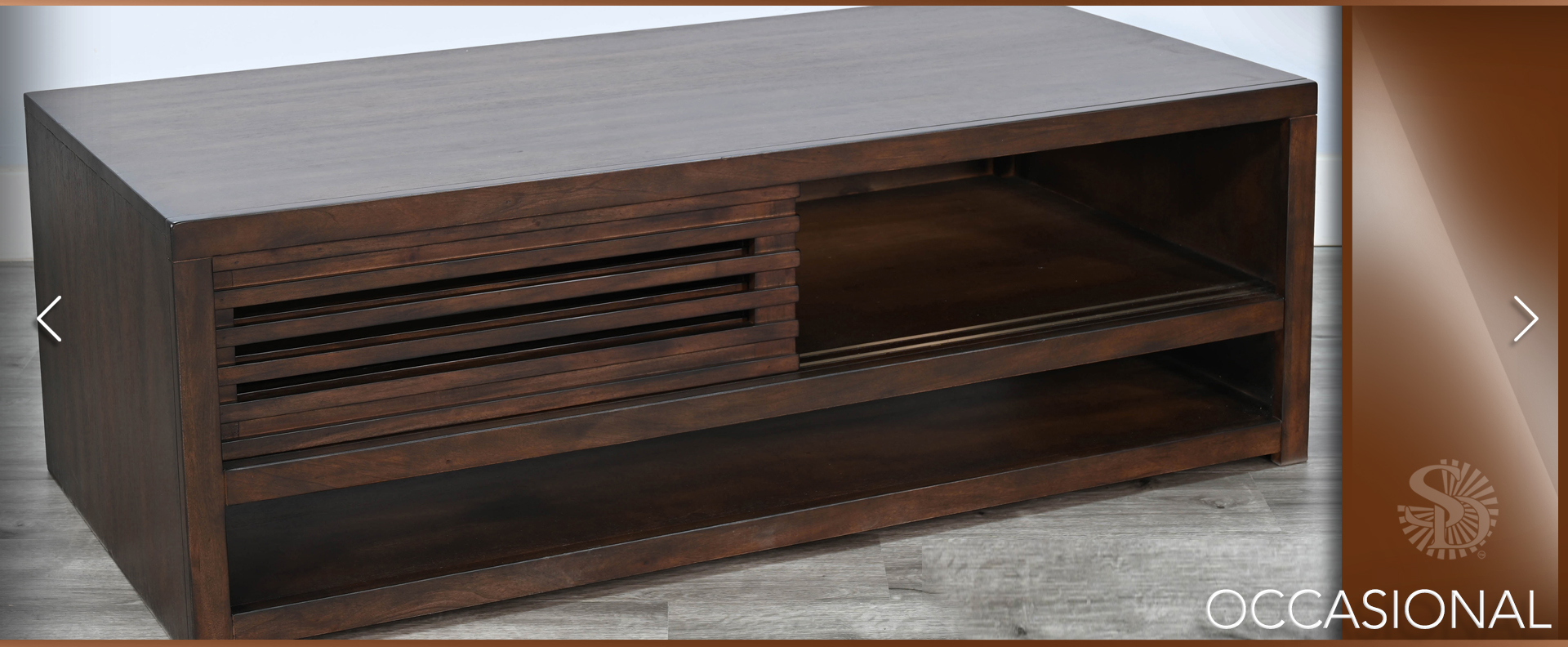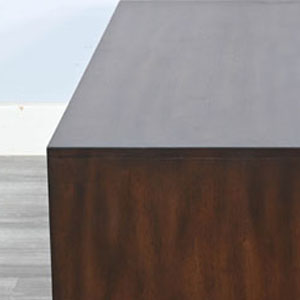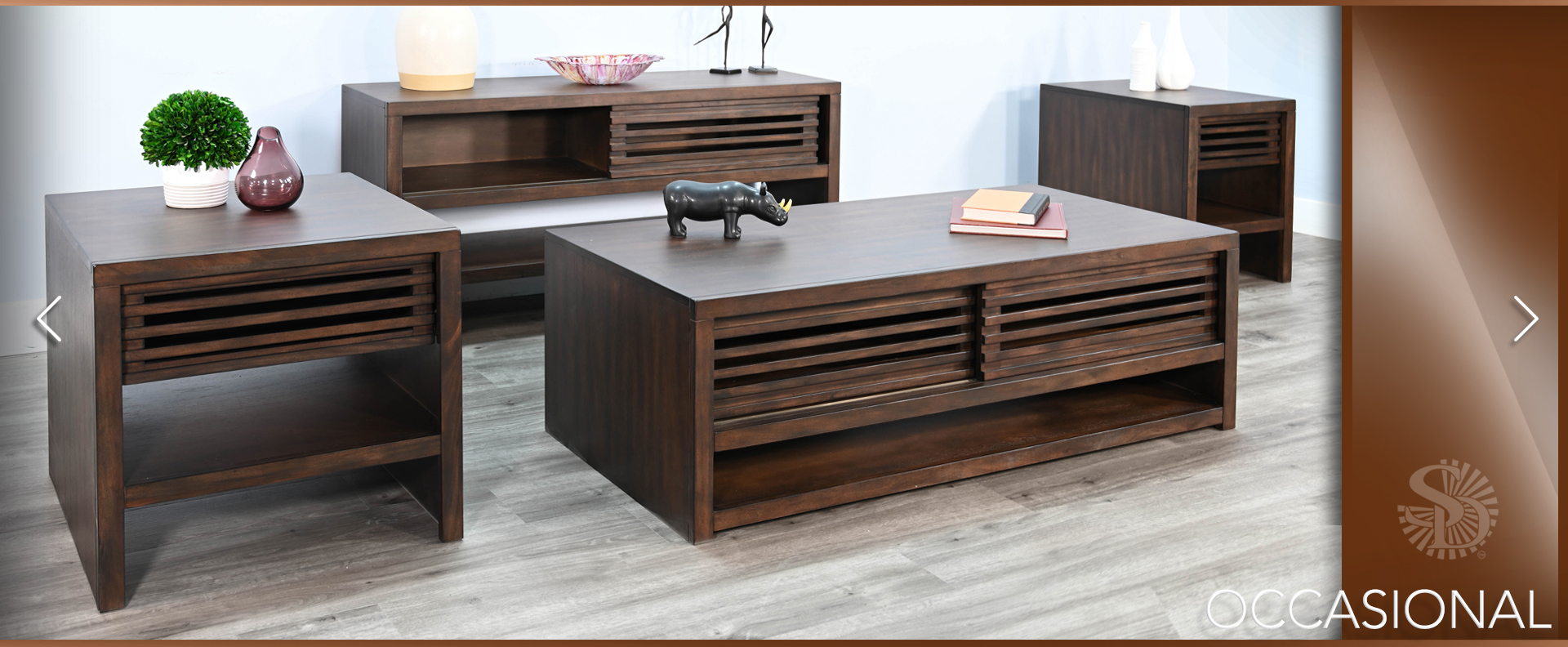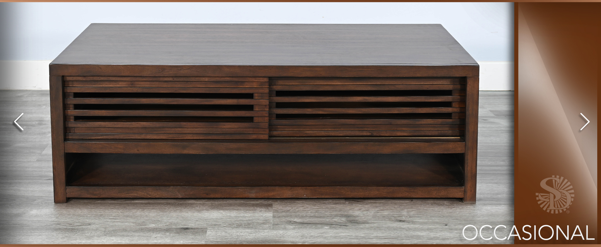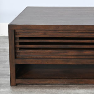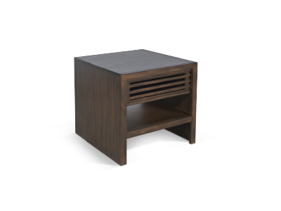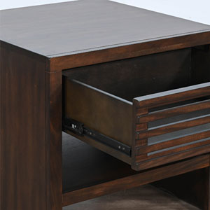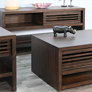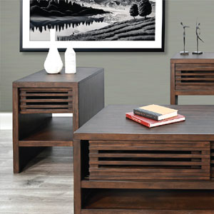 These contemporary occasional tables offer semi hidden storage behind sliding doors and a lower display shelf. Built with mahogany solids and veneers and finished in a sophisticated Coffee Bean finish.