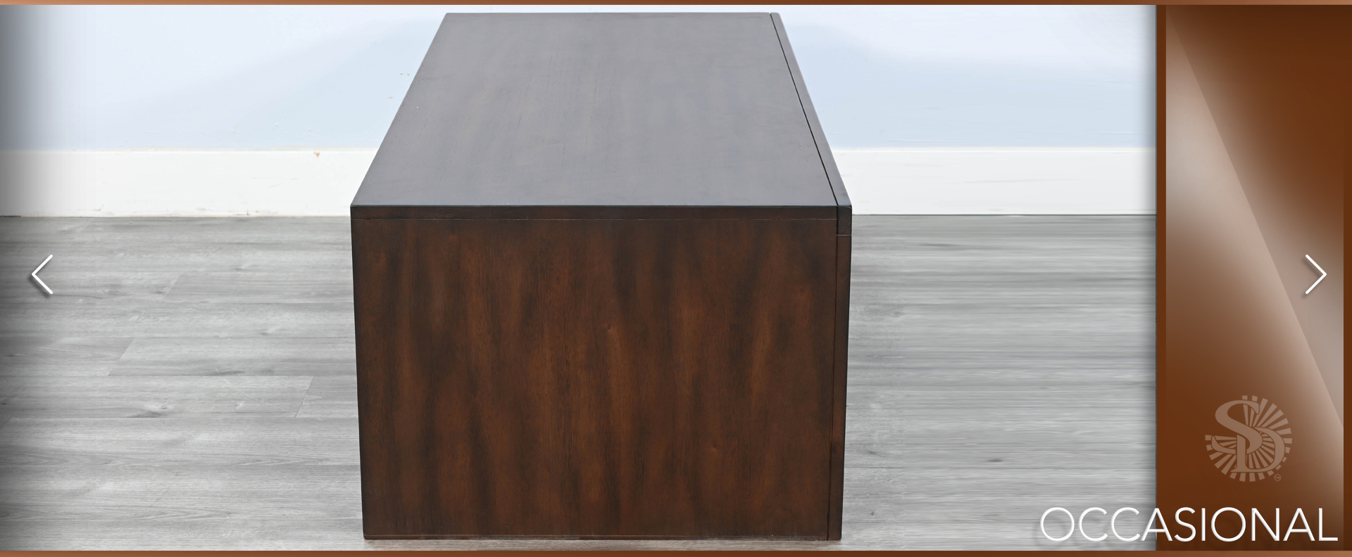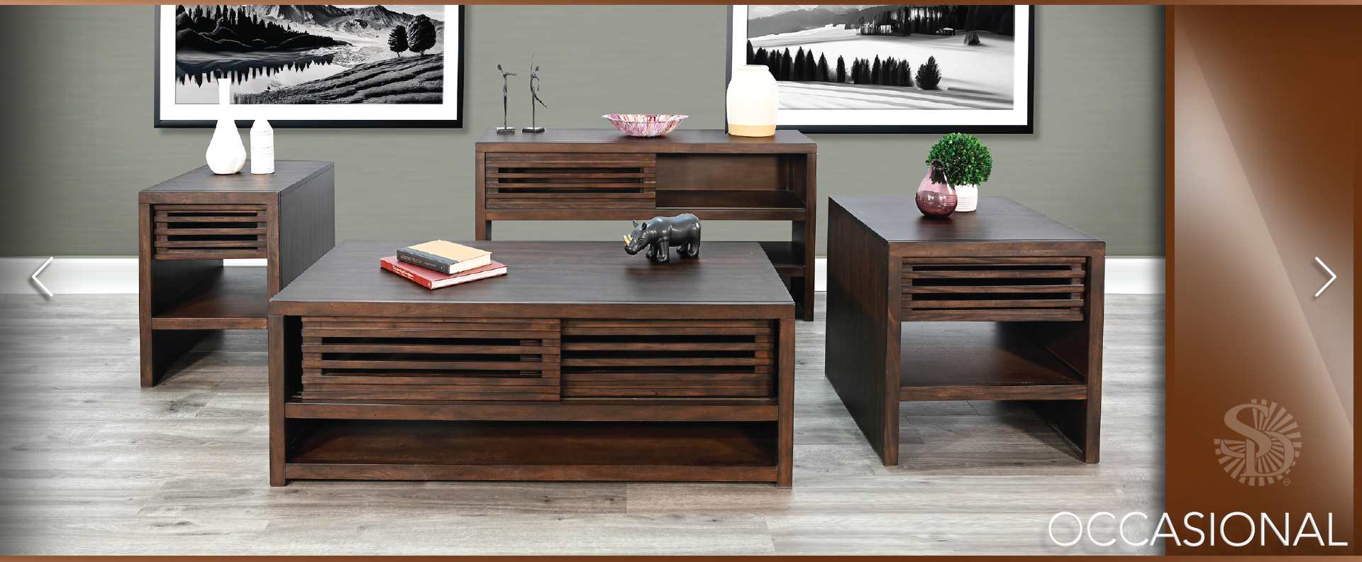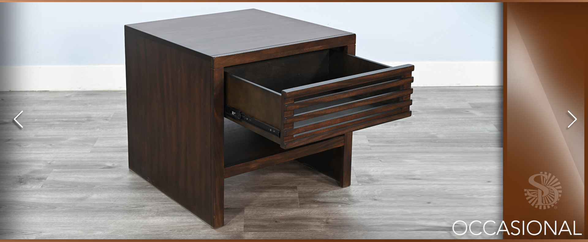 These contemporary occasional tables offer semi hidden storage behind sliding doors and a lower display shelf. Built with mahogany solids and veneers and finished in a sophisticated Coffee Bean finish.