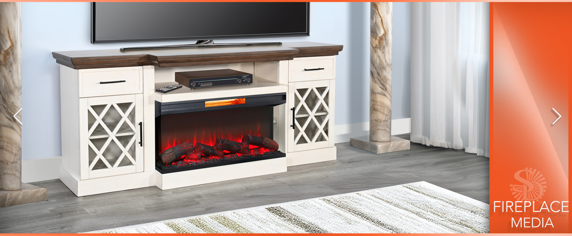 Elevate your living space with our elegant media console featuring a warm firebox insert. Crafted from mahogany solids and veneers, it boasts a Marble White & Buckskin finish. With adjustable shelves, built-in wire management, and a timeless design, this console is both stylish and functional—perfect for any modern home.