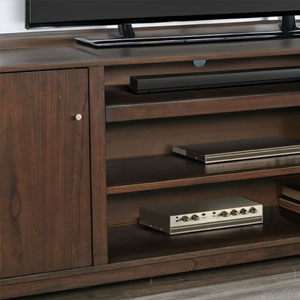 The Jane media cabinet is mid century modern in style with a 3 sided tray top, tapered legs, clean hardware and overall lines. Multi functional as well with the ability to use fireplace insert, with an abundance of storage for everything you want to hide. Finished in a warm walnut, it exudes vintage charm.