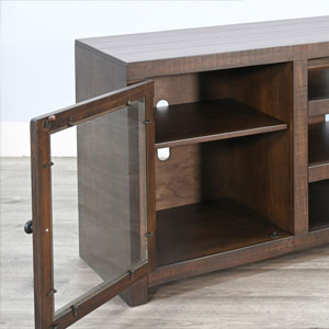 Crafted with timeless elegance and rustic charm, the Homestead Media Console is the perfect centerpiece for your living space. Built from mahogany solids and veneers, this console showcases rough sawn distressing, giving it a beautifully weathered appeal that complements both modern and traditional interiors. The Tobacco Leaf finish enhances the rich wood grain, adding warmth and sophistication to any room. Designed for versatility, the console features adjustable shelves to accommodate media components, decor, and more, while cord management ensures a clean and organized setup.