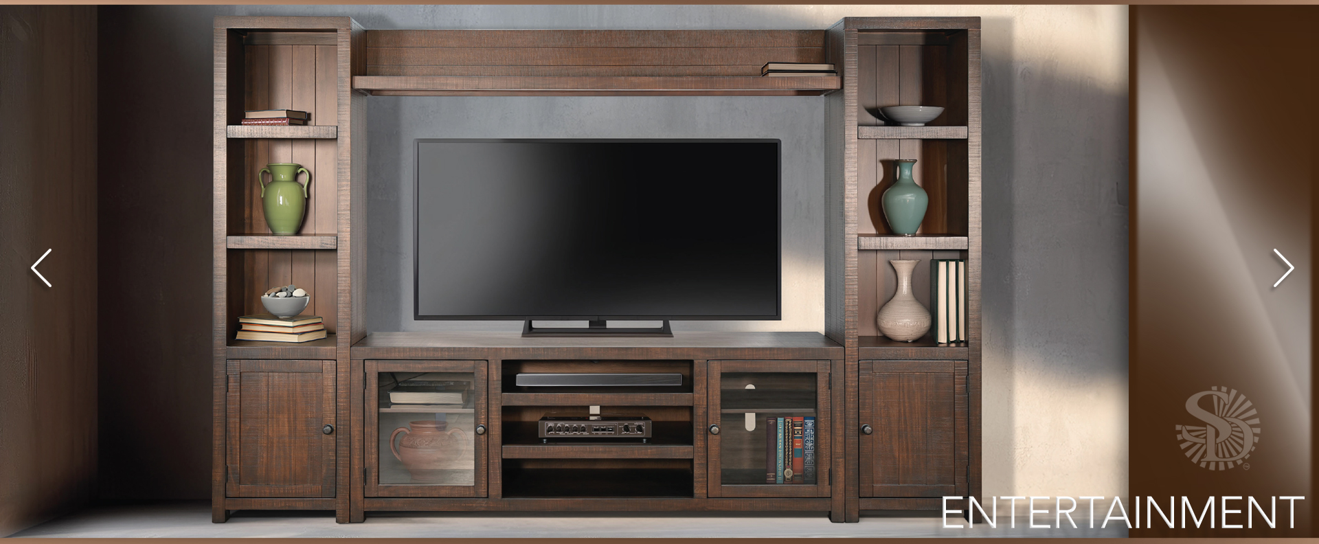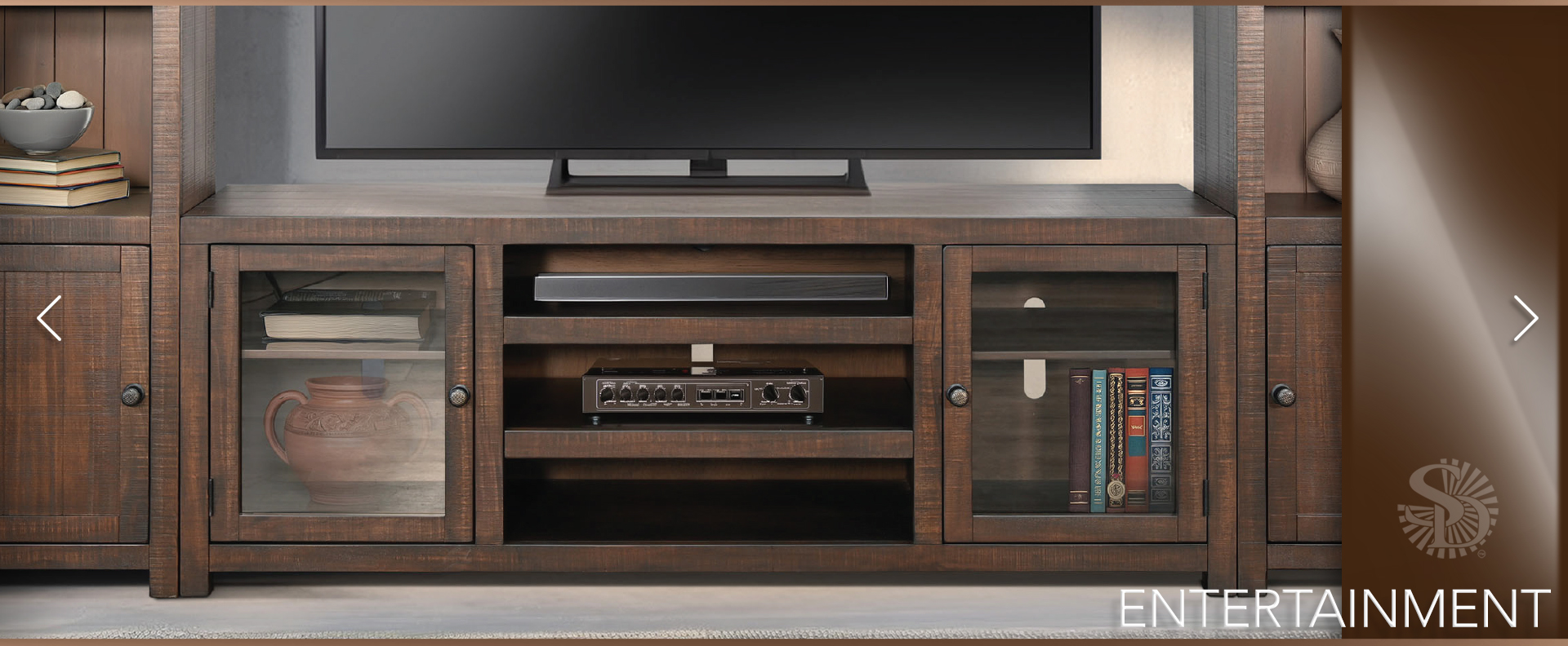 The Homestead entertainment wall was built with rough sawn mahogany solids and veneers. The rustic knobs accentuate