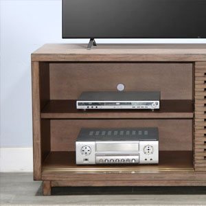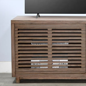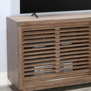 it features cord management, adjustable shelves, and two sliding doors with wooden slot panels. The Buckskin finish adds