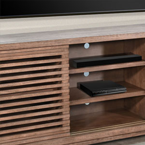it features cord management, adjustable shelves, and two sliding doors with wooden slot panels. The Buckskin finish adds
