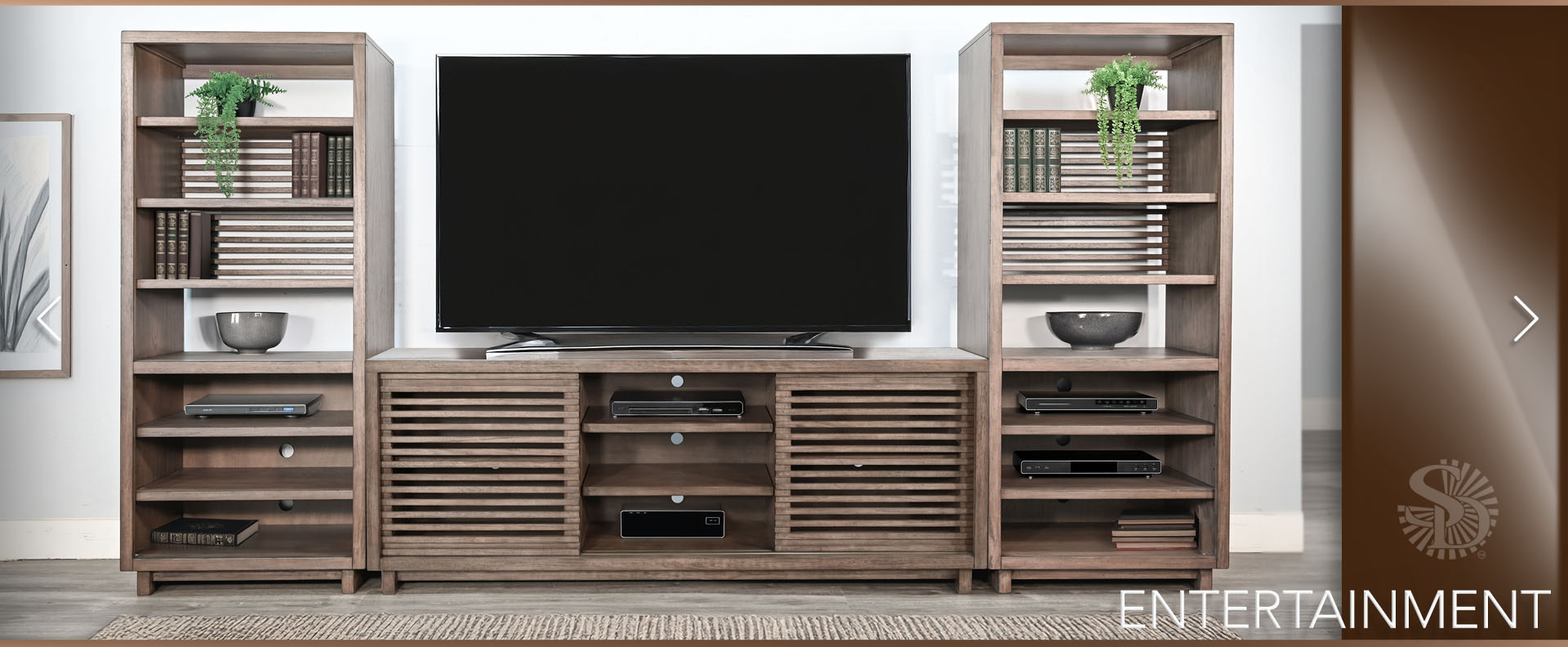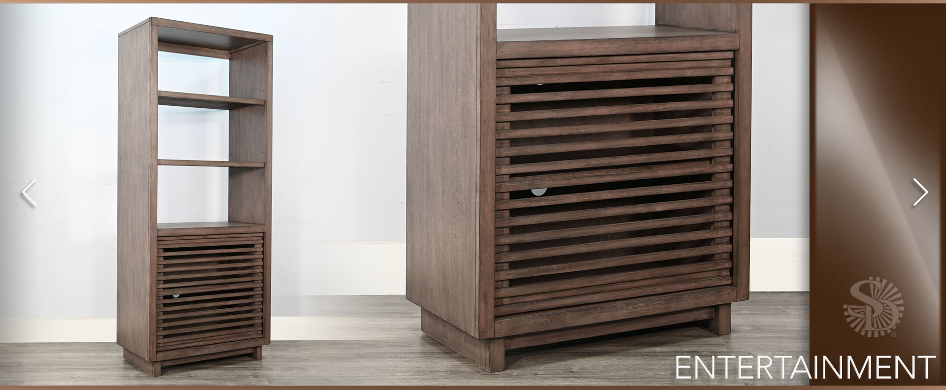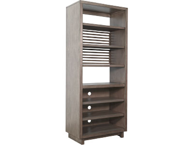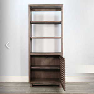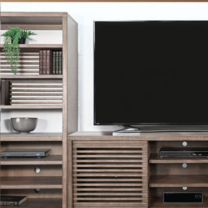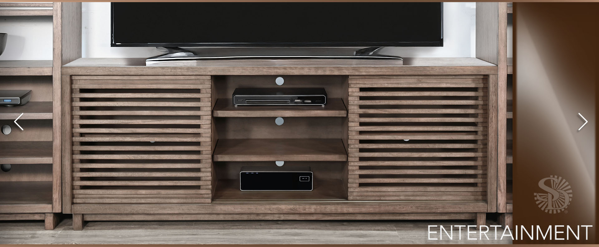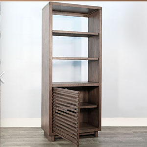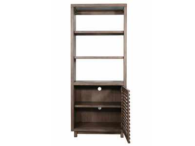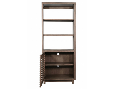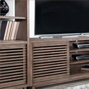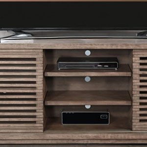 Discover our sleek media console, expertly crafted from mahogany solids and veneers. Designed for modern living, itfeatures cord management, adjustable shelves, and two sliding doors with wooden slot panels. The Buckskin finish adds a touch of sophistication to your entertainment space.