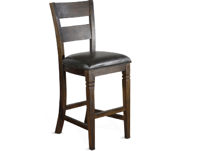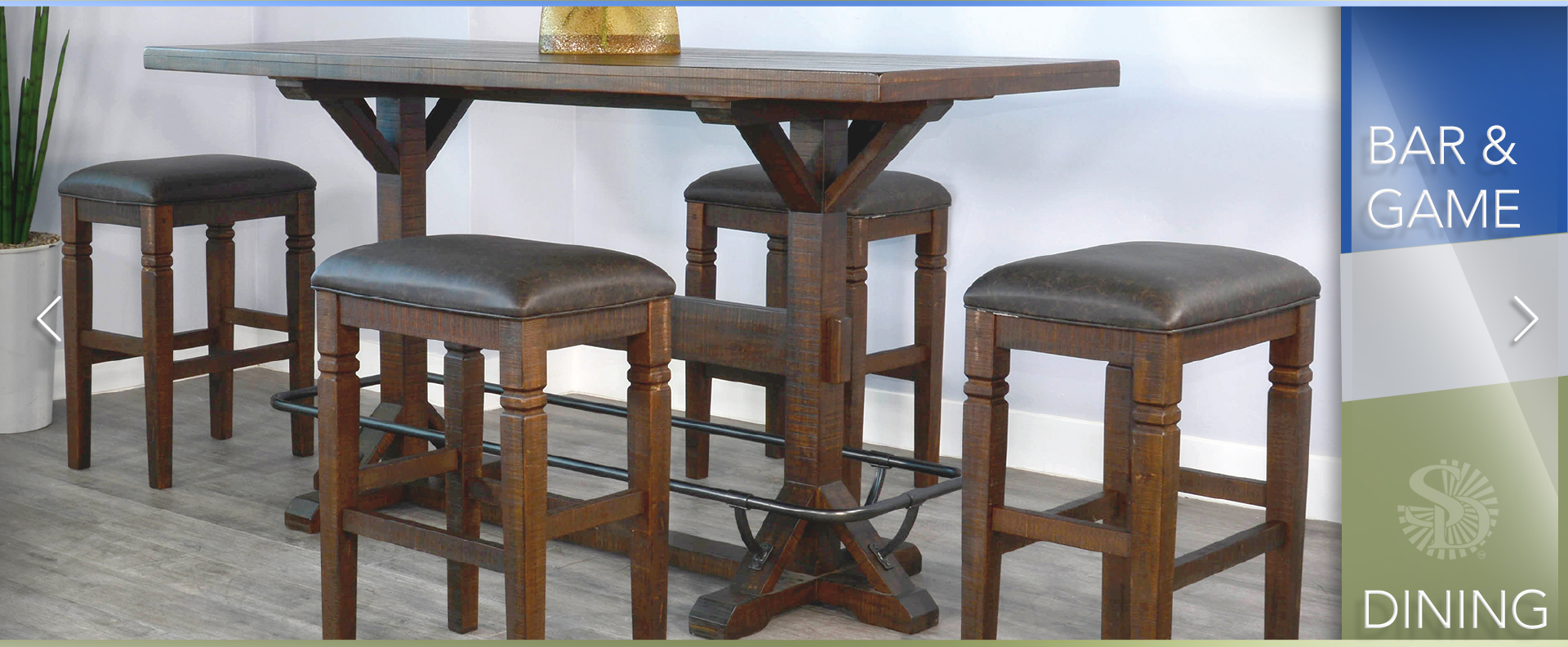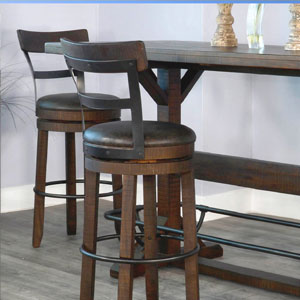 The Homestead pub table was constructed with mahogany and mindi solids and veneers. Its design suggests contemporary with industrial trades and its metal foot rail gives it a very unique look and practicality