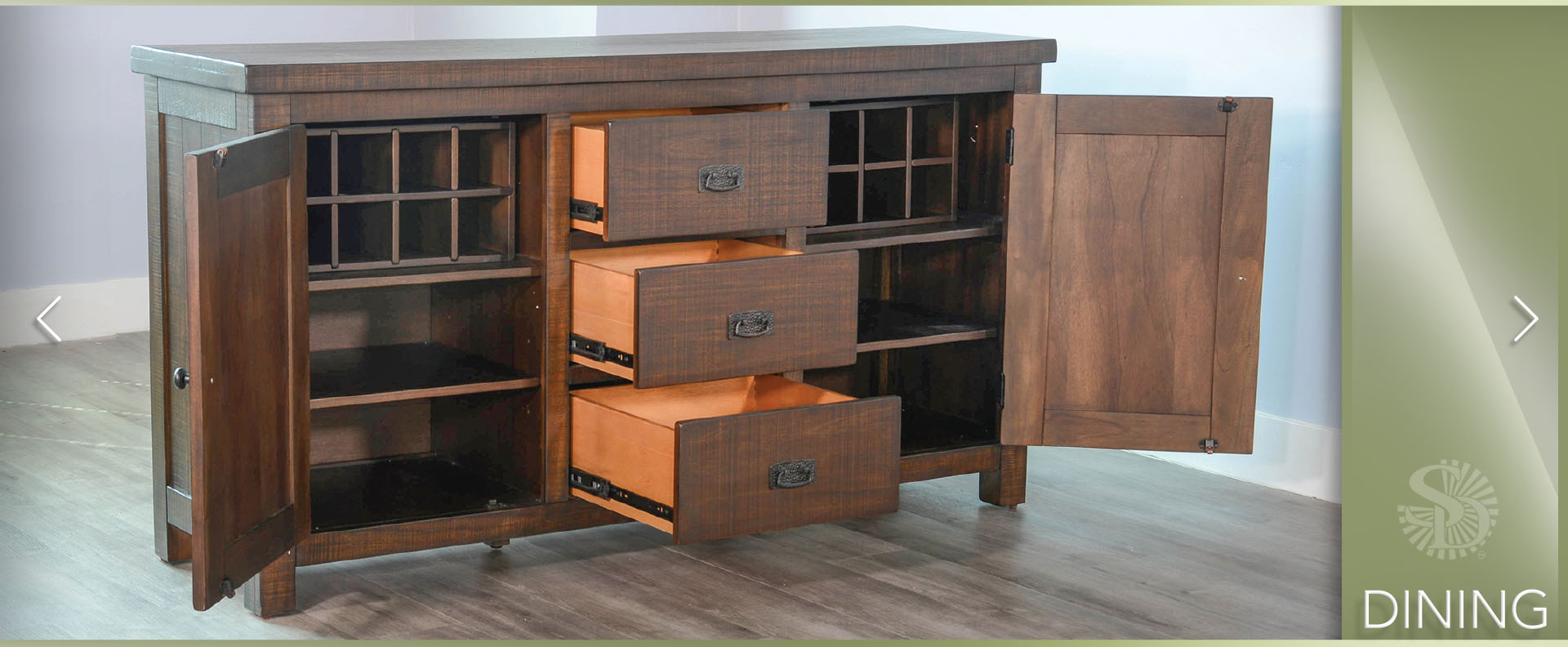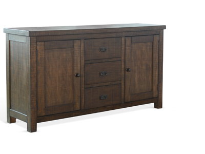 hardware accents, like turnbuckle stretchers. The server has removable wine racks, two adjustable shelves, and three