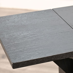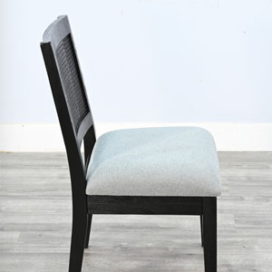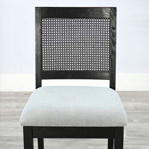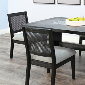The Geovanni dining set is constructed with wire-brushed mindi solids and veneers. This set is ideal for small to medium