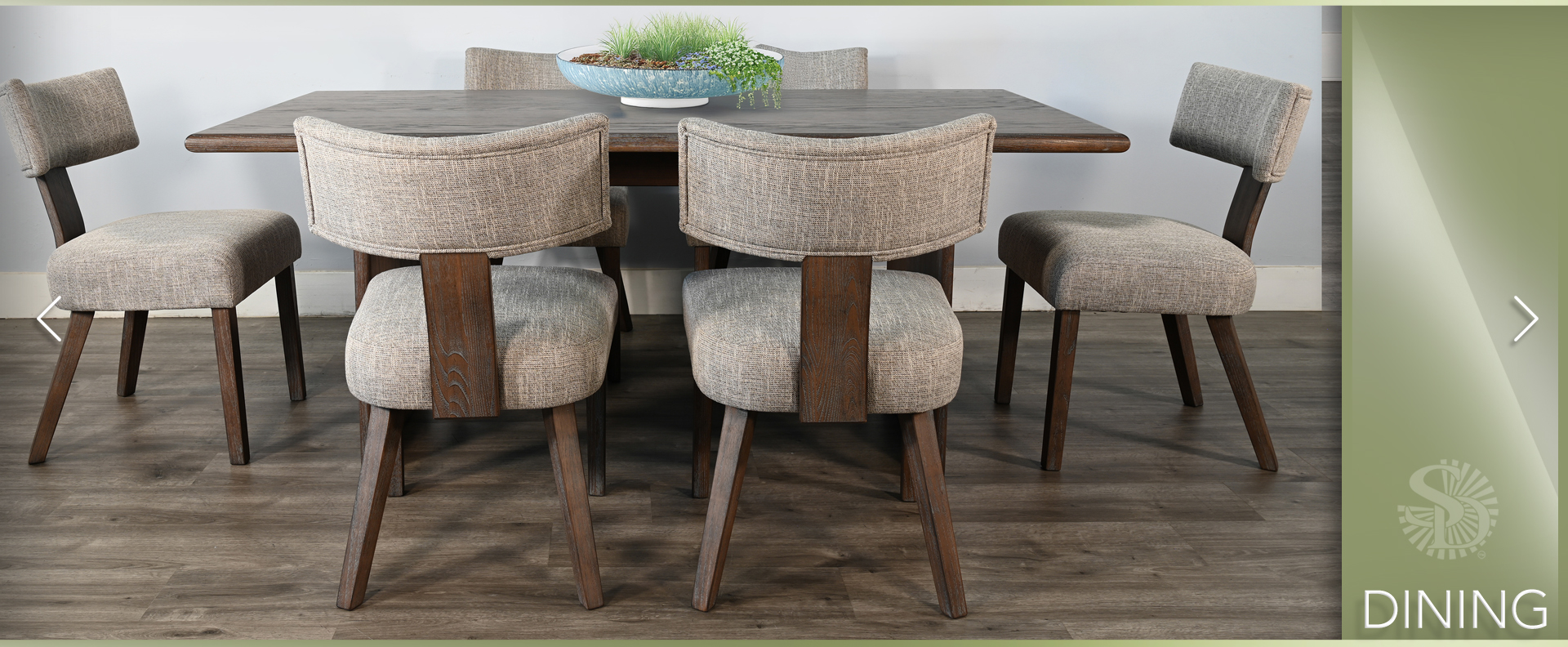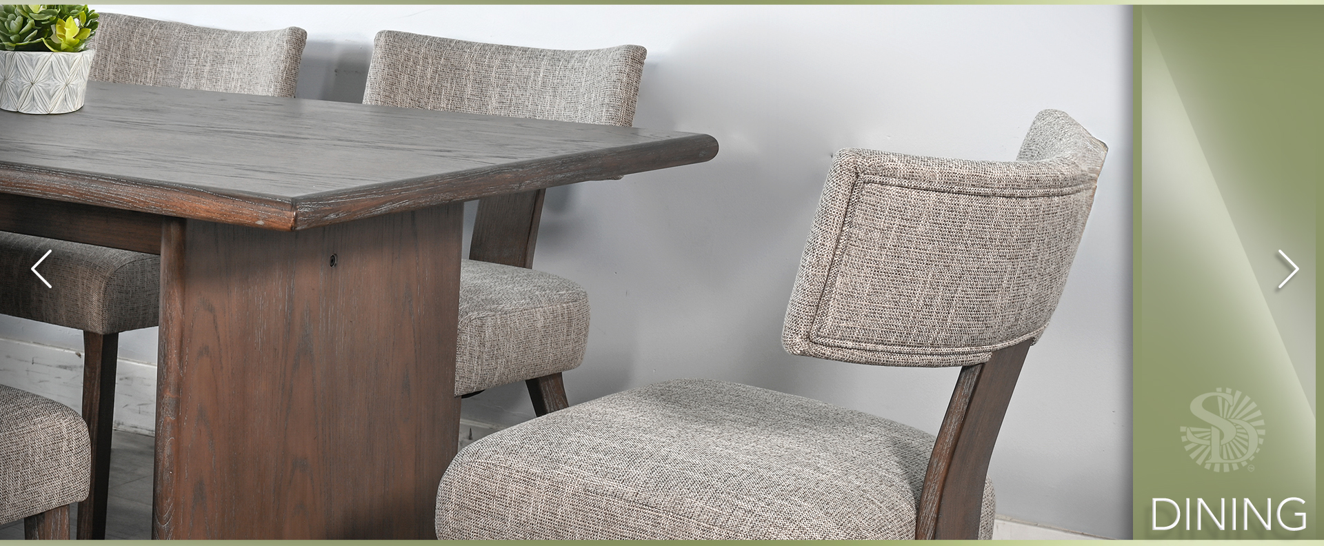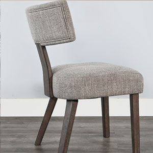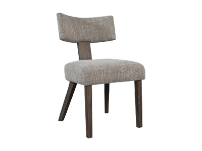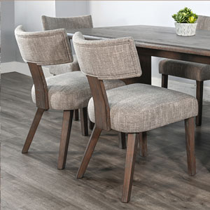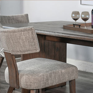 upholstered chairs, the set combines soft, textured fabric with the warmth of wood for a look that feels both stylish and relaxed.
