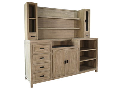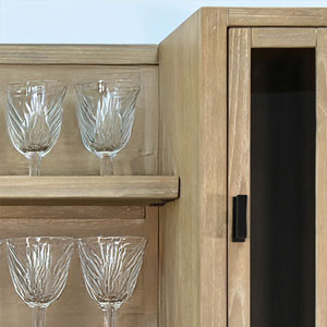 The Walton Back Bar combines functionality with timeless style. Crafted from wire-brushed mindi solids and veneers, it offers ample storage to keep your bar essentials organized and within reach. Finished in a warm Wheat tone, this piece brings a touch of rustic elegance to any space.