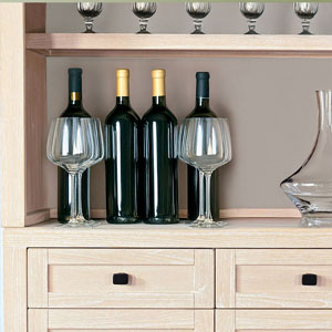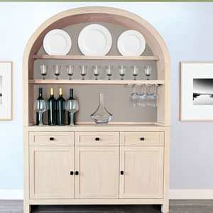 The Liz Wine & Coffee Bar Cabinet blends style and versatility for the perfect at-home serving station. Crafted from wire-brushed mindi solids and veneers, it features a sturdy