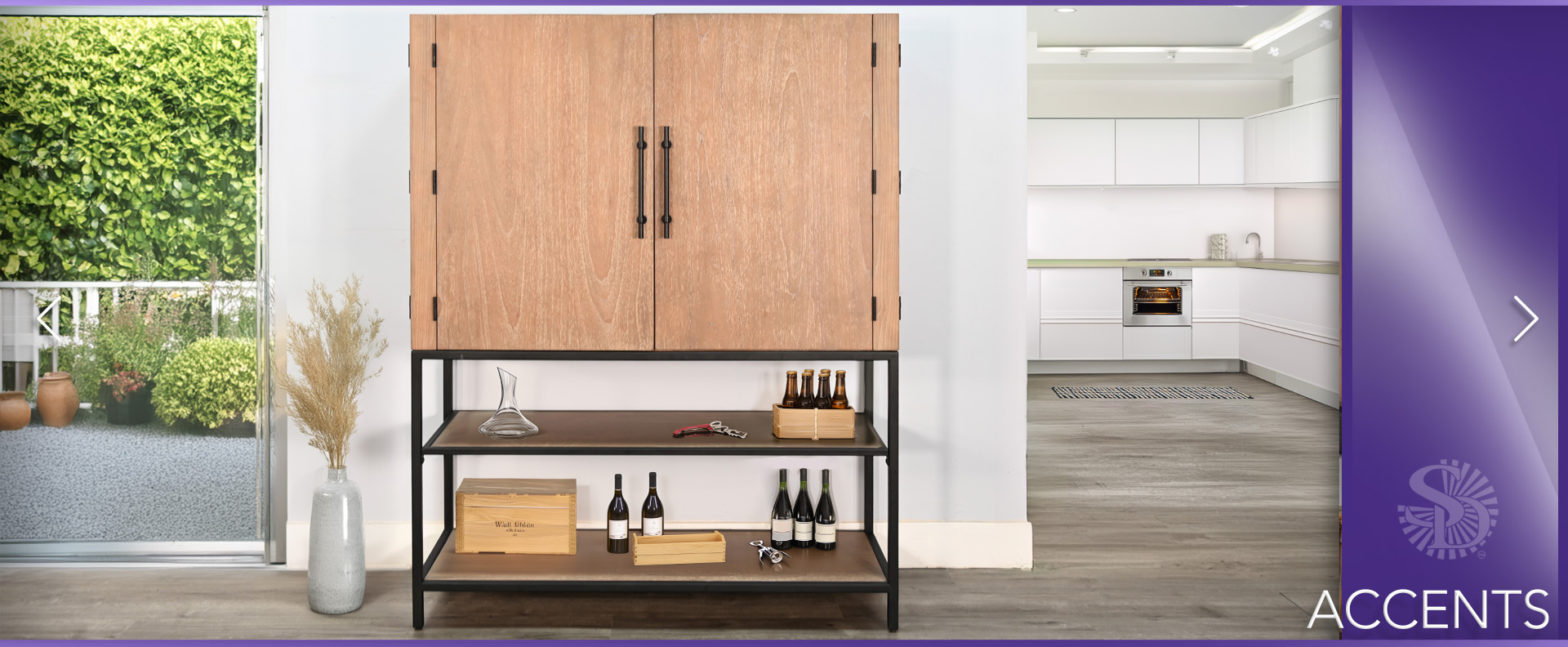 The Violet Wine Bar Cabinet is the perfect blend of functionality and style. Crafted from wire-brushed mindi solids and veneers, this elegant piece showcases a rich Oak Grove finish that enhances its natural beauty.