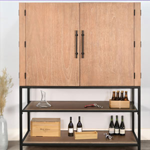 Designed for both storage and serving, the metal base supports a spacious interior with two shelves, offering ample room for your favorite bottles and bar essentials. The fully swinging doors conveniently store on the sides, providing easy access while maximizing space.