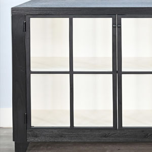 The Ryan industrial long accent cabinet boasts a modern elegance with its sleek design, making it a sophisticated