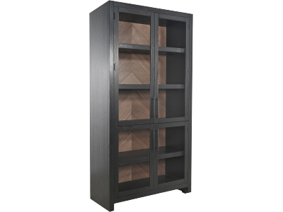 Crafted from Sungkai solids and veneers, the Uptown Tall Cabinet brings refined modern style to any space. Its tall, streamlined profile is balanced by a warm, chevron-patterned wood back panel and framed glass doors that showcase everything inside. Sturdy shelving offers generous storage and display space, while the dark finish adds depth and contemporary sophistication. A striking statement piece designed to elevate both function and aesthetic in the home.