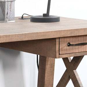 Crafted from rough sawn mahogany solids and veneers, the Vivian Writing Desk seamlessly blends contemporary, industrial, and traditional design elements. Its rich texture and refined character make it a striking centerpiece in any space. Designed with modern convenience in mind, it features built-in power outlets and one USB and USB C ports, ensuring your devices stay charged and ready. Expertly crafted in Indonesia, this desk set delivers both timeless style and everyday functionality, making it the perfect addition to your home or office.