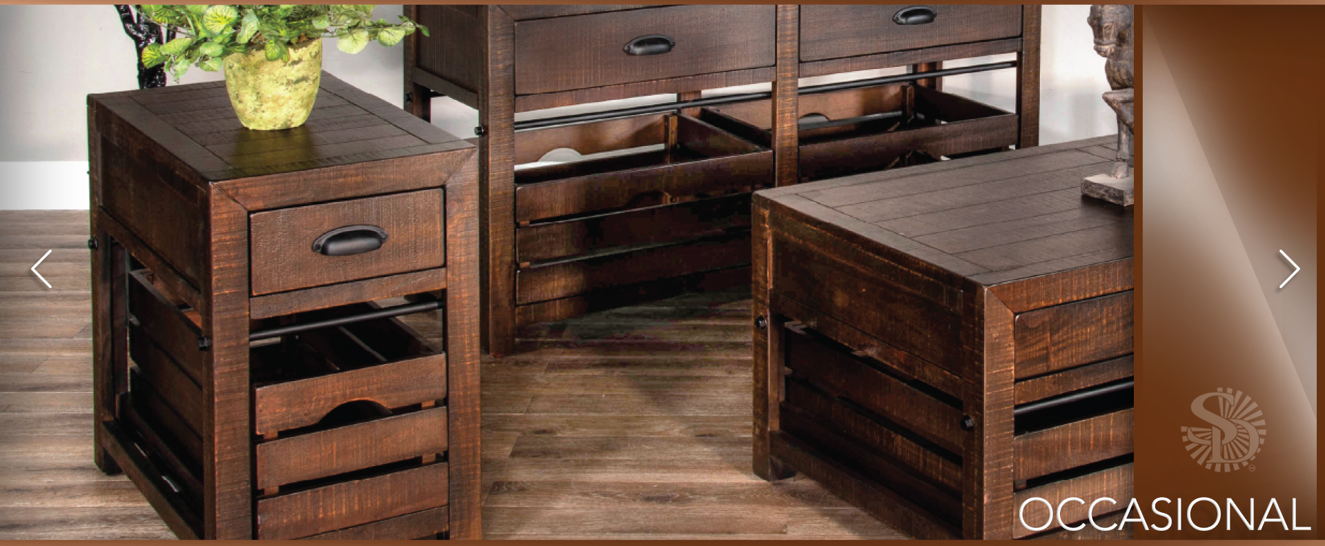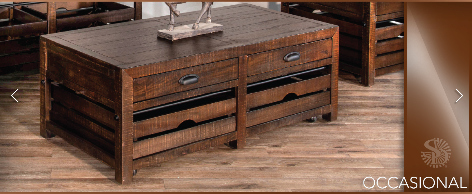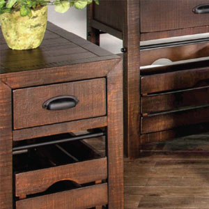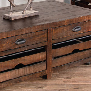 The Homestead occasional set features a beautiful rough sawn Tabacco Leaf finish. All pieces have a metal bar accent. Removable crates and large drawers offer tons of space for storage.