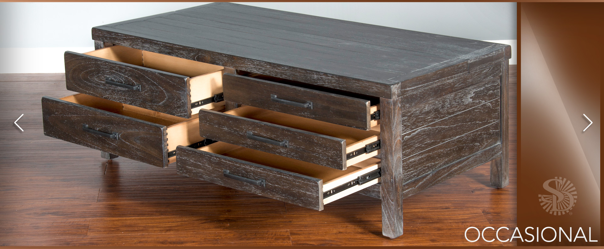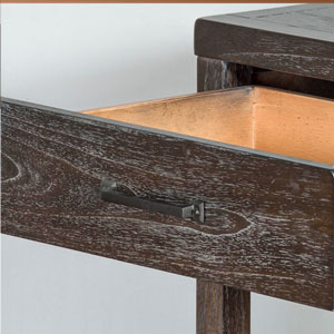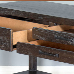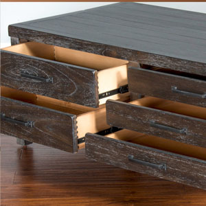 The Dundee occasional set has an attractive rustic black finish called Kettle Black. The decorative hardware almost blends in with its design. All the drawers have full extension ball bearing guides.