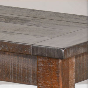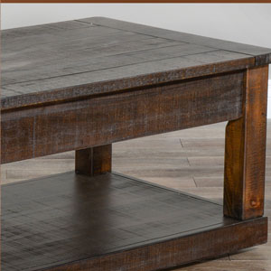 The Homestead occasional table set is robust and sturdily constructed with rough sawn mahogany solids and veneers. The coffee table features two drawers and hidden casters. All pieces have been completed with a plank top.
