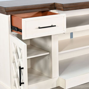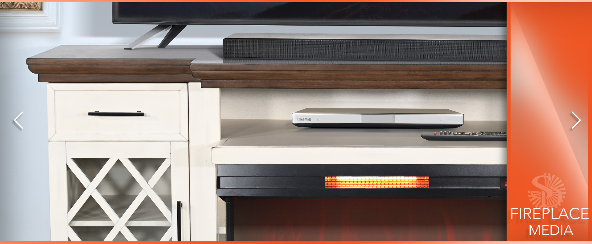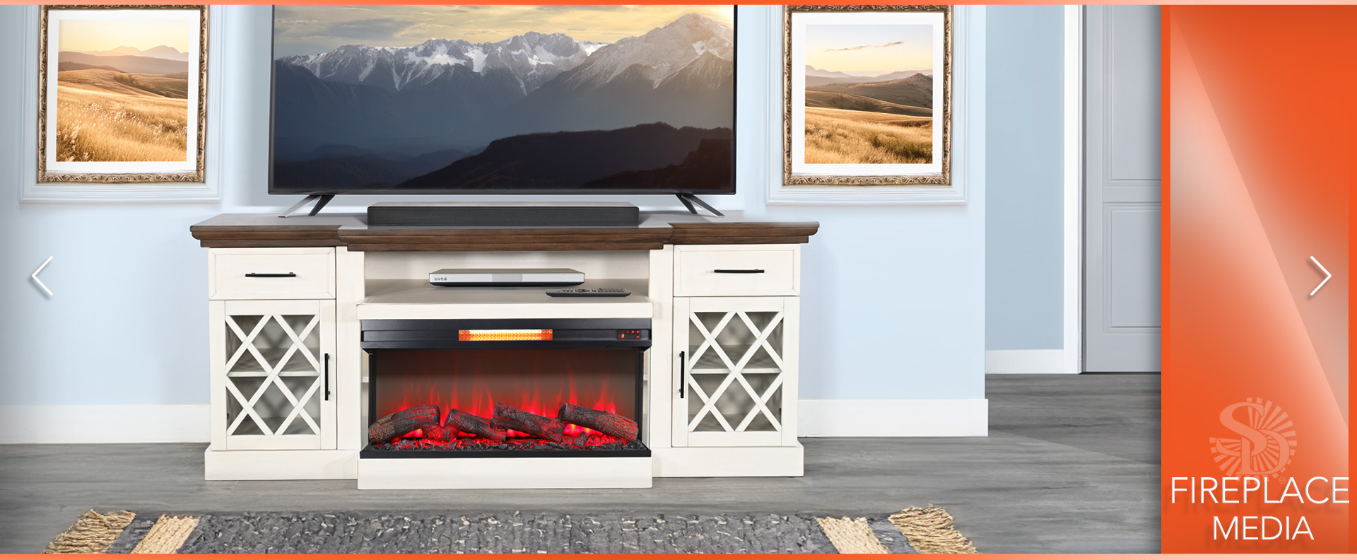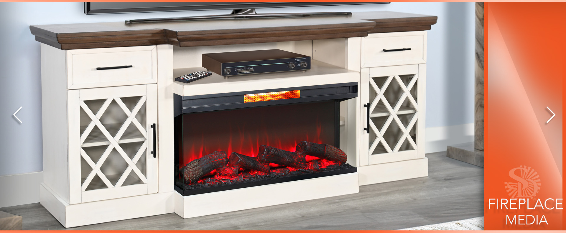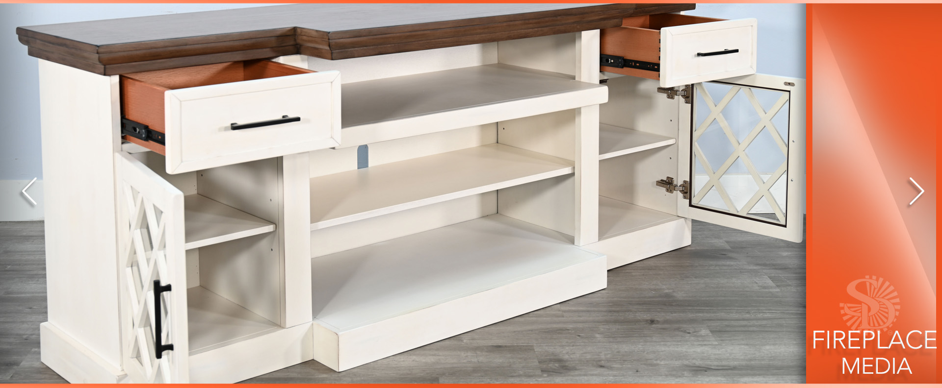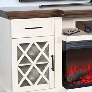 Elevate your living space with our elegant media console featuring a warm firebox insert. Crafted from mahogany solids and veneers, it boasts a Marble White & Buckskin finish. With adjustable shelves, built-in wire management, and a timeless design, this console is both stylish and functional—perfect for any modern home.
