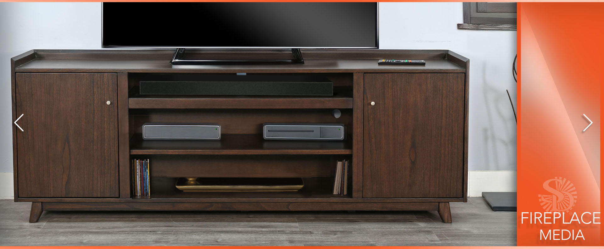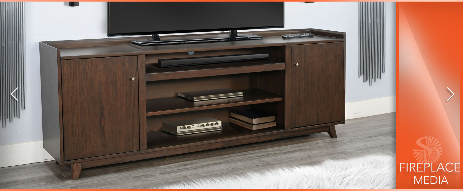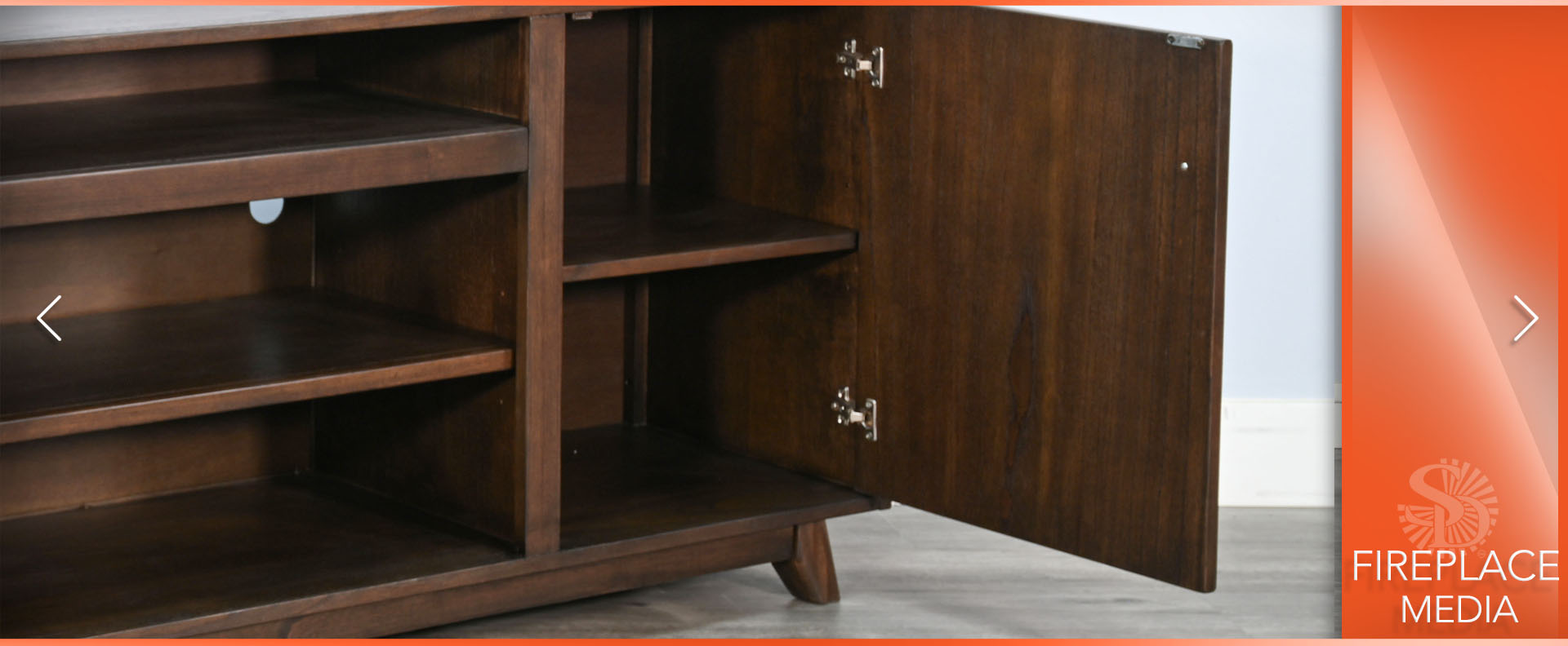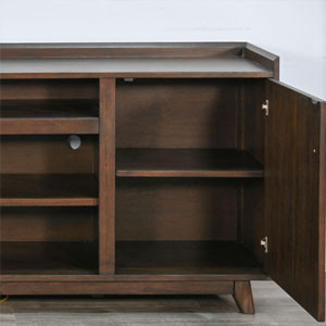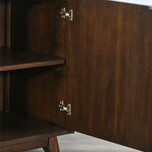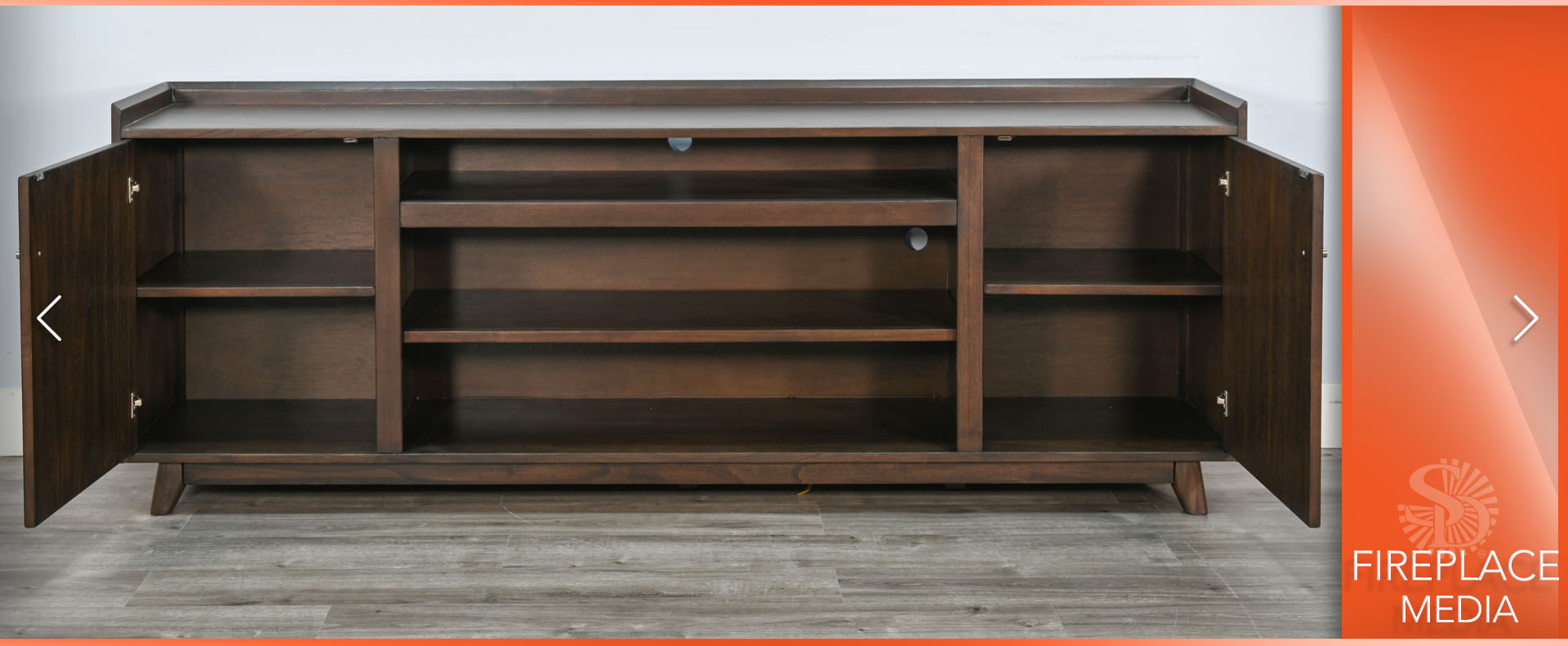 The Jane media cabinet is mid century modern in style with a 3 sided tray top, tapered legs, clean hardware and overall lines. Multi functional as well with the ability to use fireplace insert, with an abundance of storage for everything you want to hide. Finished in a warm walnut, it exudes vintage charm.