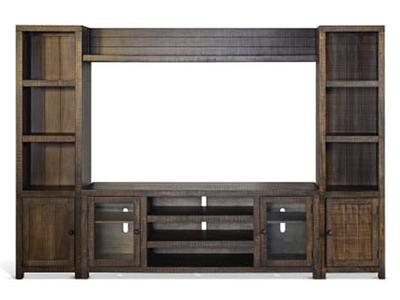 The Homestead entertainment wall was built with rough sawn mahogany solids and veneers. The rustic knobs accentuate