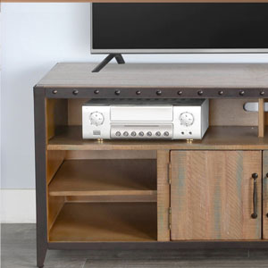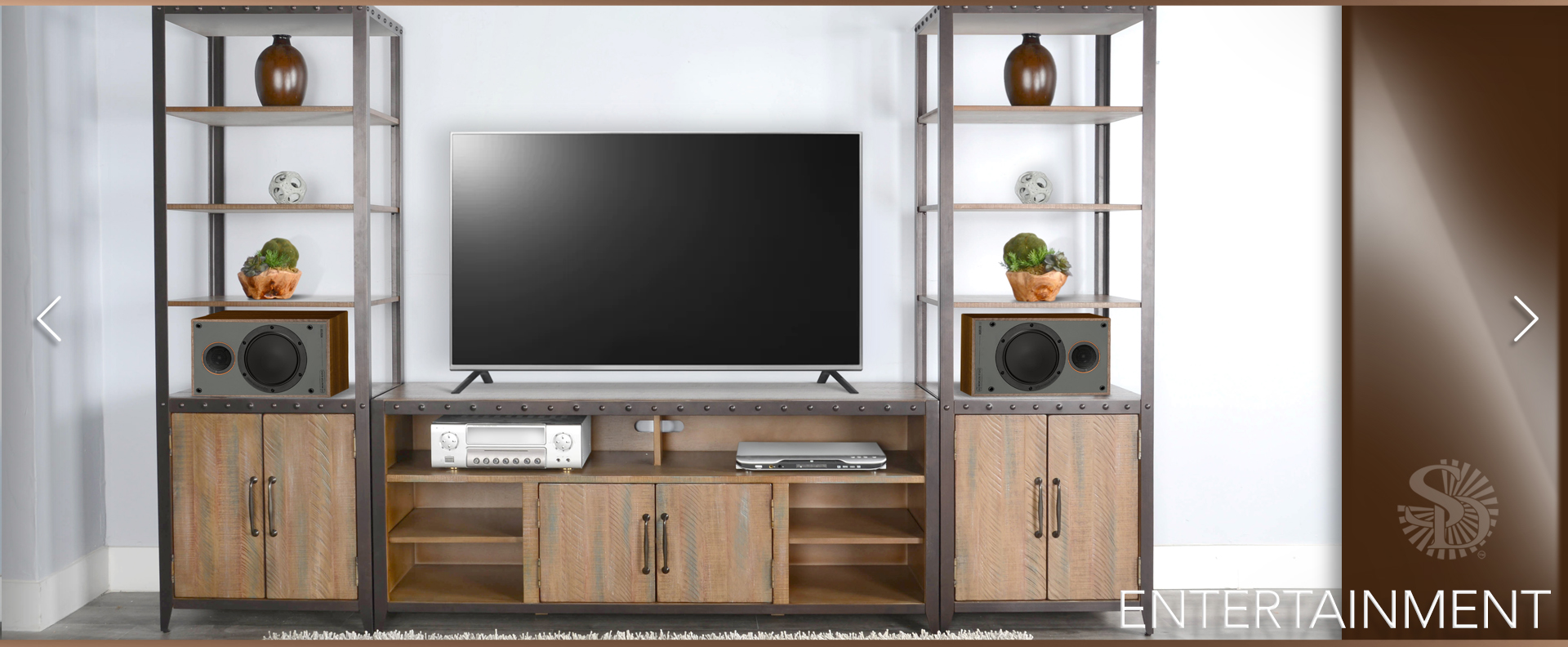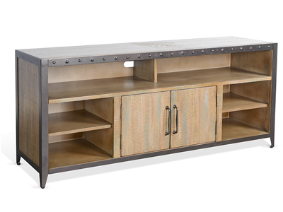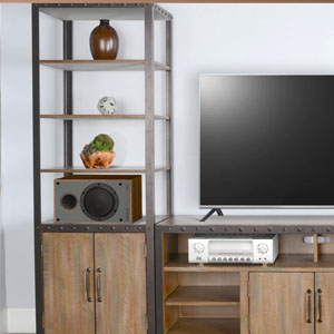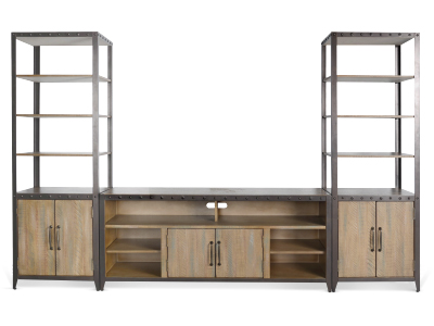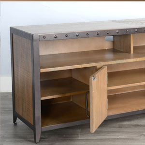 The San Diego entertainment wall was built with mahogany solids and veneers. The rustic knobs accentuate the wood grain character in beautiful Antique Brown finish.