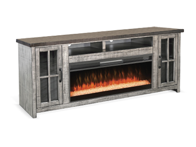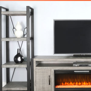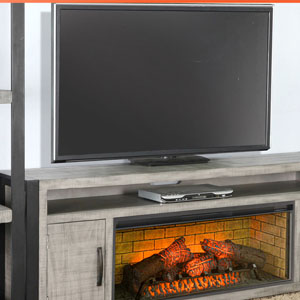 This entertainment wall is contemporary and full of features like adjustable shelves, cord management for electronics, and metal cross stretchers in the piers. In addition its constructed with mahogany solids and veneers and finished Alpine Grey.