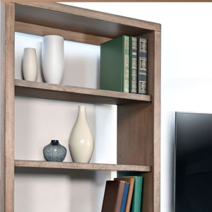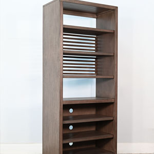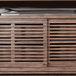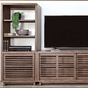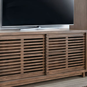 Discover our sleek media console, expertly crafted from mahogany solids and veneers. Designed for modern living, itfeatures cord management, adjustable shelves, and two sliding doors with wooden slot panels. The Buckskin finish adds a touch of sophistication to your entertainment space.