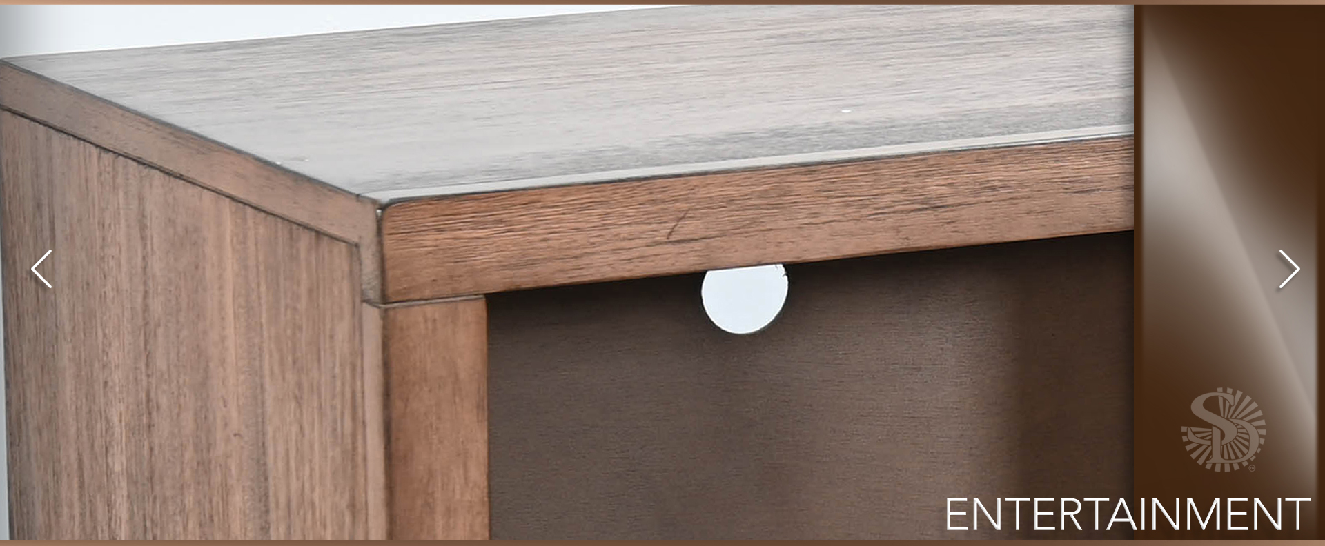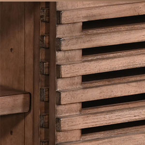 it features cord management, adjustable shelves, and two sliding doors with wooden slot panels. The Buckskin finish adds