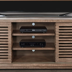 Discover our sleek media console, expertly crafted from mahogany solids and veneers. Designed for modern living, itfeatures cord management, adjustable shelves, and two sliding doors with wooden slot panels. The Buckskin finish adds a touch of sophistication to your entertainment space.