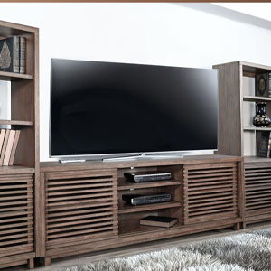 Discover our sleek media console, expertly crafted from mahogany solids and veneers. Designed for modern living, itfeatures cord management, adjustable shelves, and two sliding doors with wooden slot panels. The Buckskin finish adds a touch of sophistication to your entertainment space.